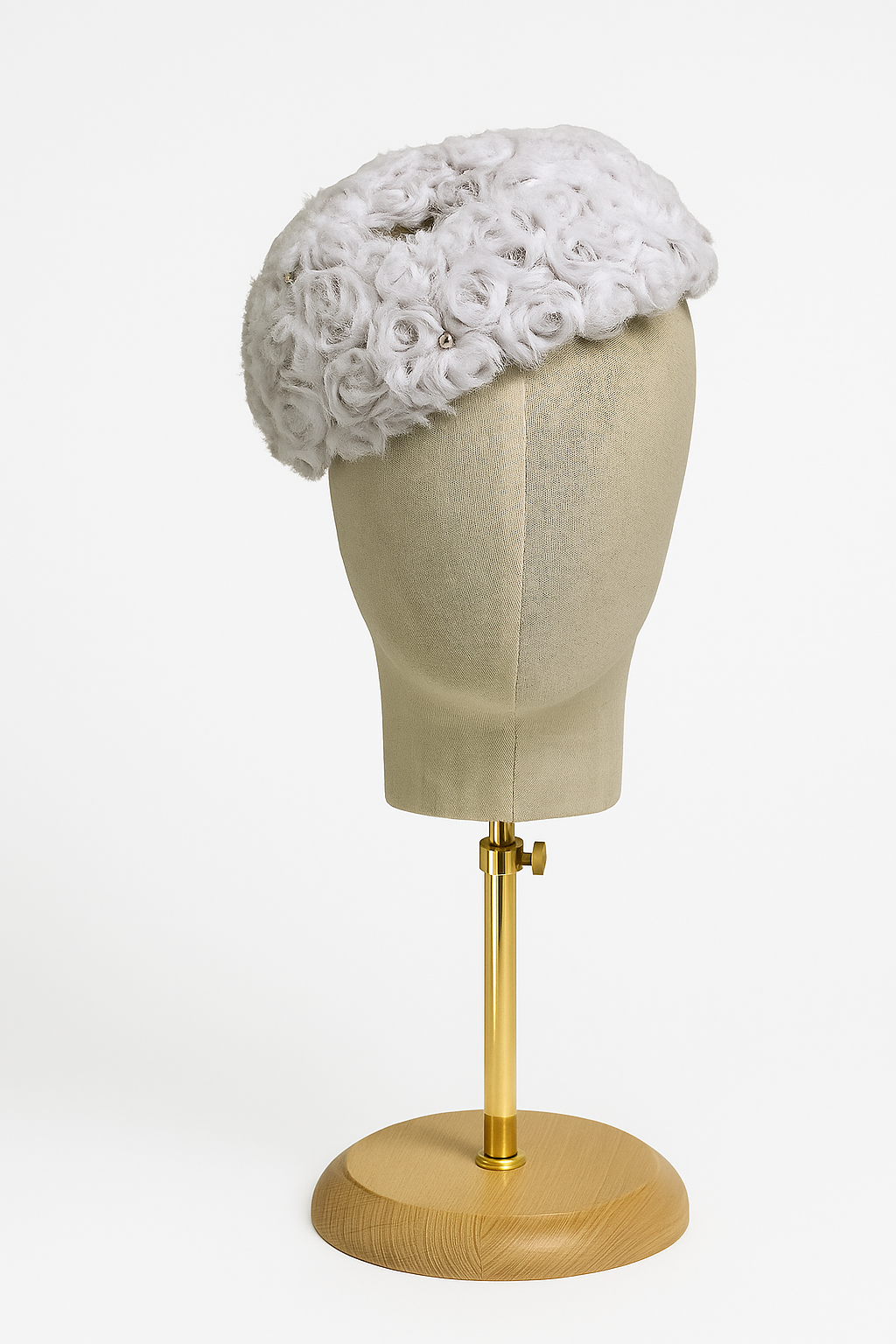 Adorning the frame are delicate chiffon rosettes, each meticulously handcrafted to form a graceful border around the oval. The soft petals of the rosettes add a romantic and feminine touch, while nestled among them are sparkling diamantés, catching the light with radiant brilliance and elevating the wedding hat with a hint of luxury.