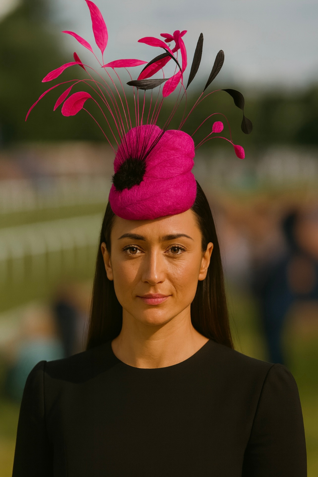 A striking expression of sophistication and modern luxury. Handcrafted from the finest fuchsia sinamay, this exquisite hat is adorned with an intricate arrangement of black and pink feathers designed to create an effortless sense of movement and drama. A delicate black floral embellishment adds depth and contrast, making this piece an unforgettable statement of refinement.
