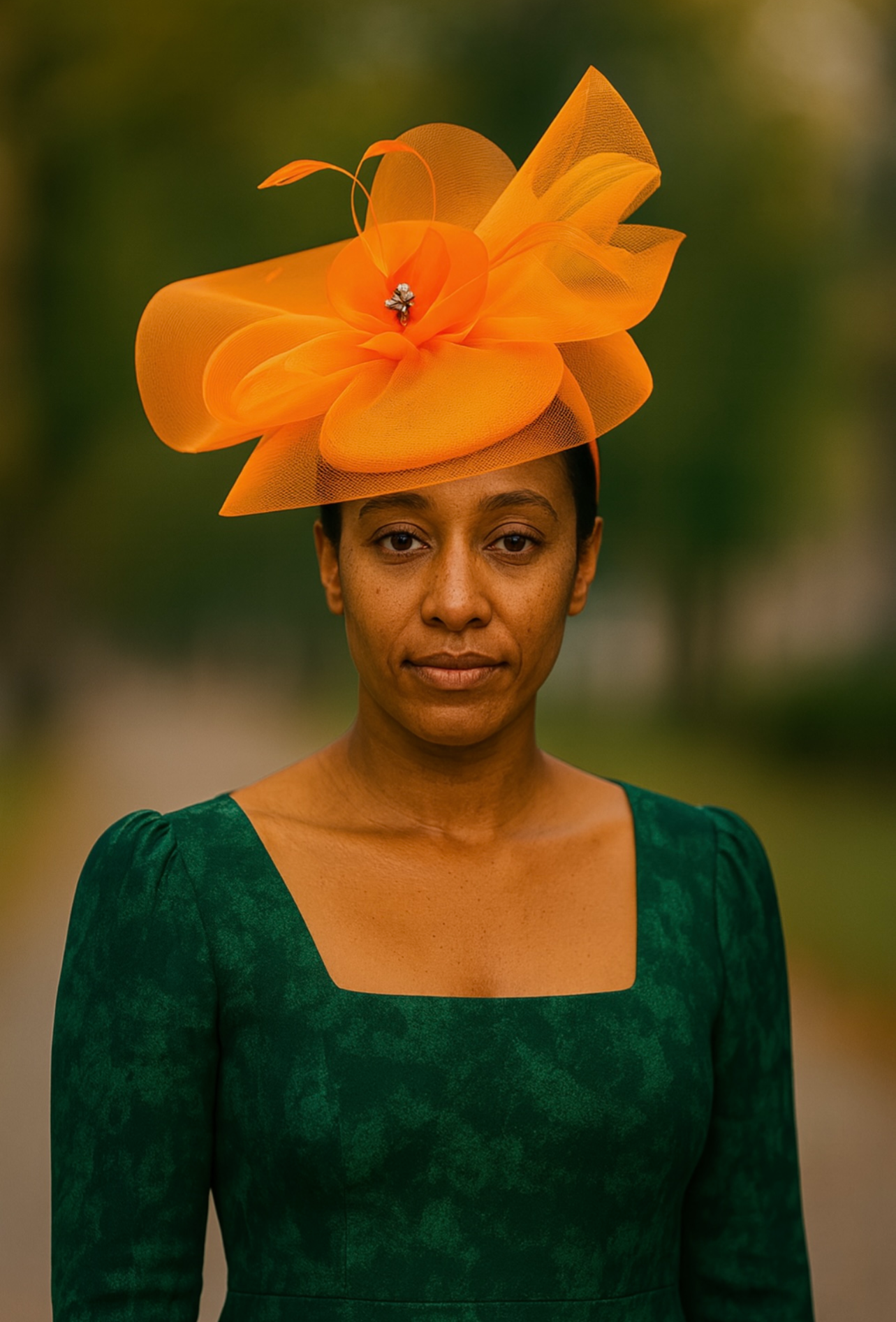 A breathtaking designer hat for women designed for the woman who commands attention with grace and confidence. Handcrafted from the finest sinamay in a luminous shade of burnt orange, this exquisite hat is a symphony of sculpted curves and delicate textures. A striking central floral motif, adorned with subtle embellishments, blooms effortlessly, creating an air of timeless sophistication.