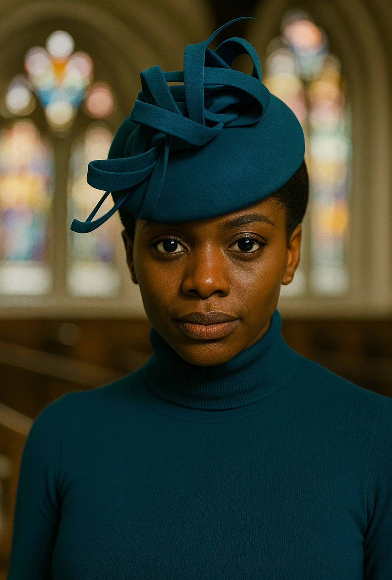 Just like the final note in a beautifully composed symphony, this teal headpiece completes your look with harmony and refinement. Designed for church and special celebrations, it’s a statement of poise, confidence, and unwavering grace. Whether you’re stepping into Sunday service or a joyful wedding, this exquisite hat ensures you shine with effortless elegance.