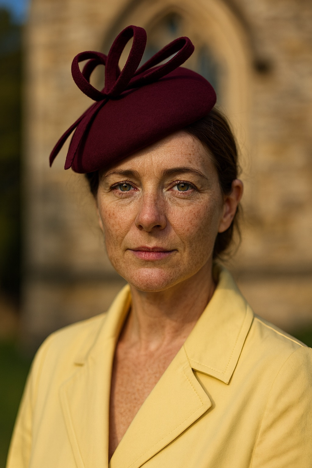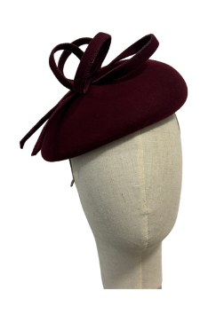 A headpiece designed to make a lasting impression. Refined, elegant, and effortlessly chic, this beautifully crafted burgundy designer hat is the perfect finishing touch for any special occasion. Featuring a structured round base in a rich, deep hue, it is adorned with delicate, sculpted loops that create a striking yet sophisticated silhouette. Whether you're dressing for a wedding, a faith event, race day, or a formal event, this exquisite hat adds an air of grace and confidence to your look.