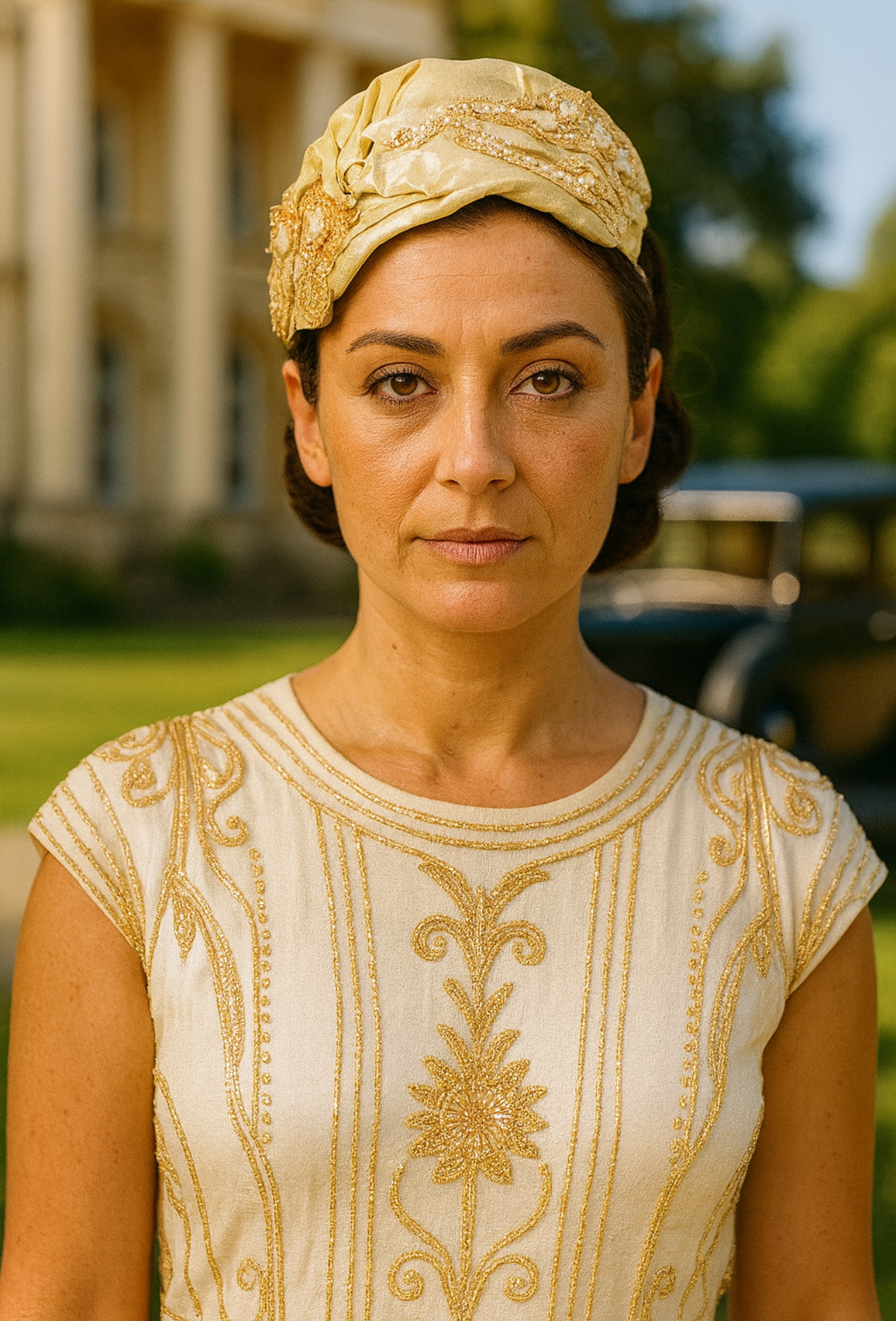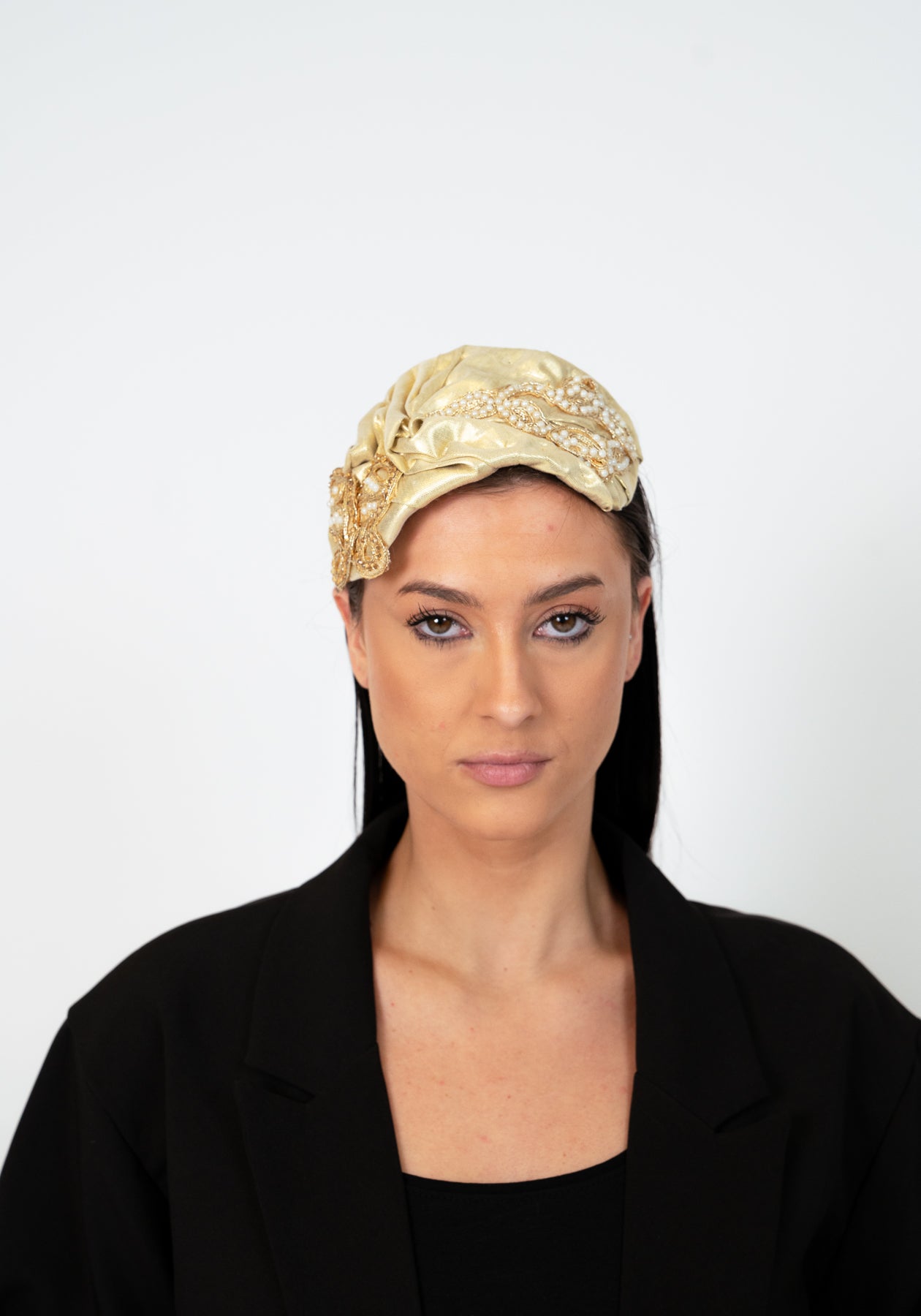Indulge in timeless sophistication with the Gold Satin Vintage hat by Brynels British Millinery. Crafted from luxuriously smooth satin, this exquisite accessory radiates vintage glamour, enhanced by matching sparkling embellishments that shimmer with every movement. A delicate pearl trim adds a touch of refinement, elevating this heritage hat into a true statement of elegance.