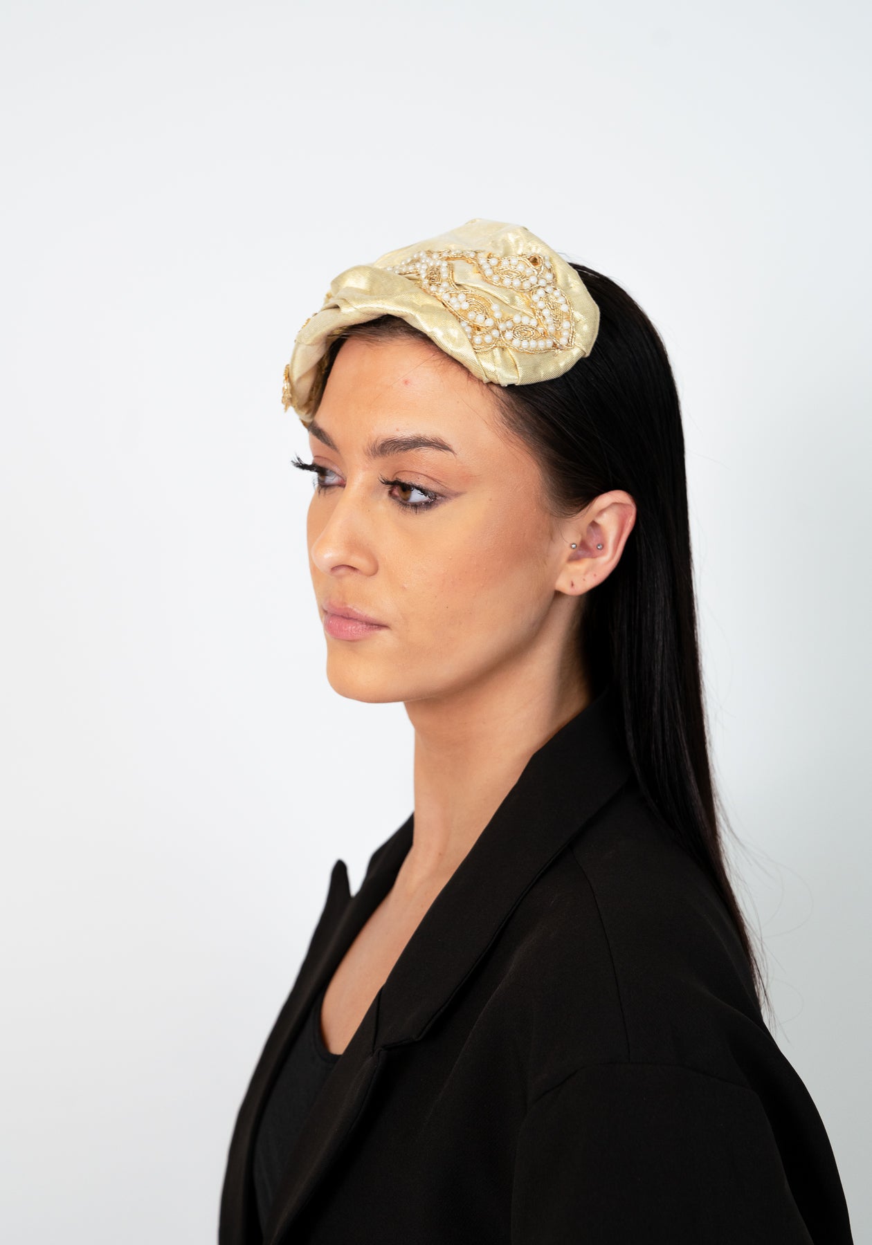 A fusion of heritage craftsmanship and modern refinement, the Brynels Gold Satin Headpiece is the perfect accessory for those who appreciate luxury with a vintage twist. Pair it with an elegant gown or a tailored suit for a look that captivates with poise and sophistication.